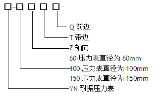 例:Y-100ZTQ 0~1MPa代表直徑為100mm,軸向帶前邊測壓范圍0~1MPa的耐振壓力表.